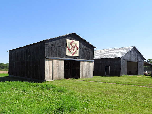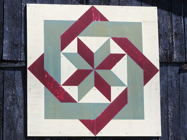 | (Labyinth Star, KY-50-31) W. of Munfordville, Hart County, KY. KY88 (West St. - becomes Cub Run Hwy) W. (curves NW) 10.3 miles from jct with Union St. in Munfordville to the quilt on the NE side of the road at 10374. Thompson Farm. (N37 17.643 W86 01.565) Photos by Jack & June Schmidt 6-20-17. |