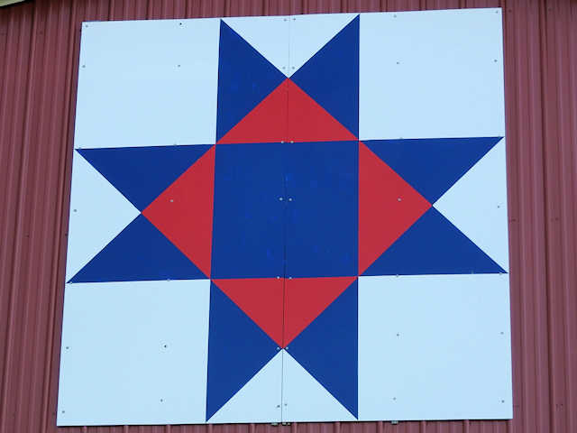 | (Ohio Star, KY-50-34) W. of Munfordville, Hart County, KY. KY88 (West St. - becomes Cub Run Hwy) W. 12.6 miles from jct with Union St. in Munfordville, S. on KY728 (Gap Hill Rd.) 0.6 miles, W. on KY728 (Gap Hill Rd.) 1.0 miles to the quilt on the N. side of the road at 1524. Joyce & Ron Gonterman. (N37 17.599 W86 04.651) Photos by Jack & June Schmidt 6-20-17. |