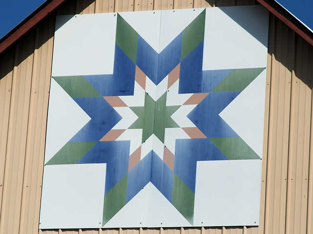 | (Lemon Twist, KY-50-48) SSW of Munfordville, Hart County, KY. US31W S. 2.4 miles from jct with KY357 (Union St.) in Munfordville, SW on KY335 (L&N Turnpike Rd.) 1.7 miles to the quilt on the NE side of the road at 1880. Linda Puckett. (N37 13.761 W85 55.028) Photos by Jack & June Schmidt 6-21-17. |