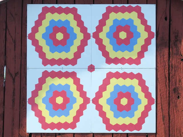 | (Flower Garden, KY-79-01) in Benton, Marshall County, KY. KY348 (Symsonia Rd.) W. 0.2 miles from jct with Purchase Pkwy exit 43 to the quilt on the S. side of the road at 616. Mattie Jo Smith. (N36 52.155 W88 22.113) Photos by Jack & June Schmidt 6-7-16. |