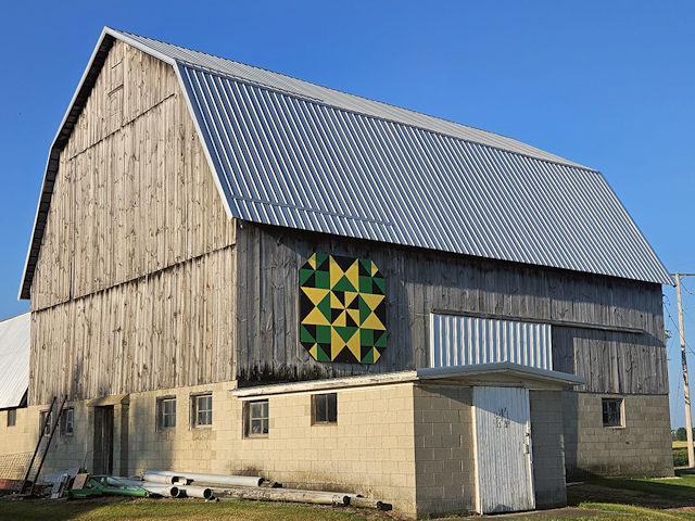 | (Untitled, MI-73-07) E. of Birch Run, Birch Run Township, Saginaw County, MI. Birch Run Rd. E. 1.5 miles from jct with I75 exit 136 on the E. side of Birch Run to the quilt on the S. side of the road at 10470. Unknown. (N43 14.975 W83 44.705) Photos by Mark Comstock 8-10-25. |