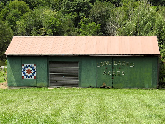 | (Carpenters Star, MO-36-08) S. of Berger, Boeuf Township, Franklin County, MO. SR B S. 1.3 miles from jct with Berger Rd. in Berger to the quilt on the W. side of the road at 3851. Long Eared Acres. (N38 39.523 W91 20.713) Photos by Jack & June Schmidt 8-1-24. |