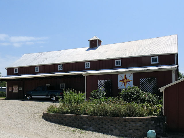 | (Untitled, MO-36-10) S. of Berger, Boeuf Township, Franklin County, MO. SR B S. 1.9 miles from jct with Berger Rd. in Berger to the quilt on the W. side of the road at 3986. Bias Vineyards & Winery. (N38 39.070 W91 20.933) Photos by Jack & June Schmidt 8-1-24. |