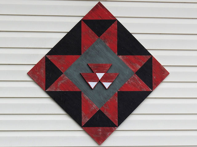| (Massey Ferguson, MO-76-06) NE of Meta, Jackson Township, Osage County, MO. MO133 NE 1.45 miles from jct with Locust St. in Meta to the quilt on the NW side of the road at 6765. Mitch Stompe. (N38 19.511 W92 08.875) Photos by Jack & June Schmidt 7-27-24. |