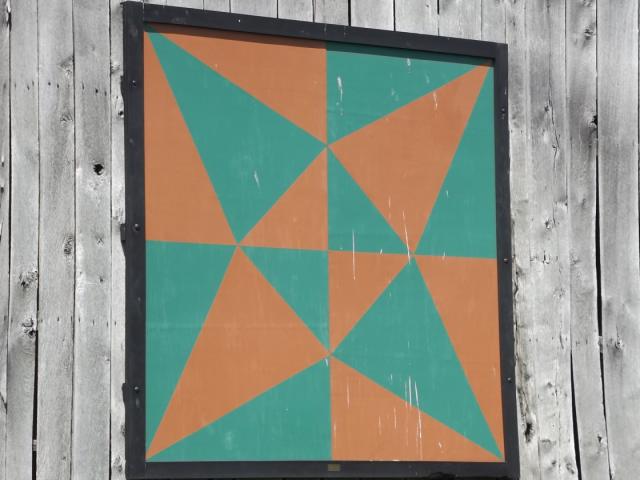 | (Crossed Canoe, OH-01-24) NW of West Union, Liberty Township, Adams County, OH. OH125 W. 3.5 miles from jct with OH41 (Manchester St.) on the W. side of West Union, N. on OH136 1.45 miles to the quilt on the W. side of the road at 10685. Newman Family Farm. (N38 49.777 W83 36.988) Photos by Jack & June Schmidt 7-23-16. |