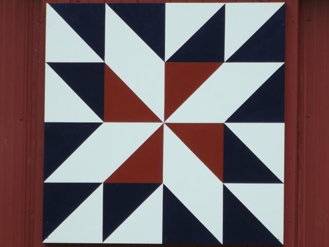 | (Pinwheel Star, OH-04-28) SW of Williamsfield, Williamsfield Township, Ashtabula County, OH. US322 W. 0.9 miles from jct with OH7 in WilliamsField, S. on Ridge Rd. 0.8 miles to the quilt on the E. side of the road at 8392. McGuinnis Farm. (N41 31.307 W80 35.524) Photos by Jack & June Schmidt 6-23-15. |