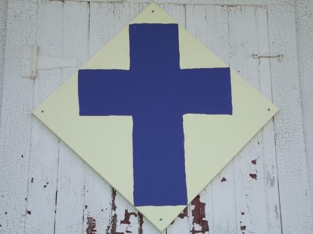 | (Cross, OH-04-40) in the County Fairgrounds in Jefferson, Ashtabula County, OH. Walnut St. W. 0.25 miles from jct with OH46/307 (Chestnut St.), N. on Elm St. 250 to the quilt on the W. side of the road. Grange Building. (N41 44.471 W80 46.500) Photos by Jack & June Schmidt 6-23-15. |