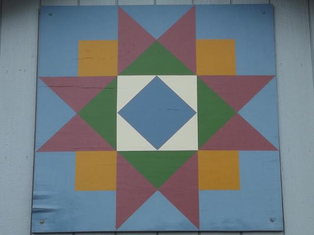 | (Ohio Star Variation, OH-32-42) S. of Arcadia, Washington Township, Hancock County, OH. TR254 S. 0.75 miles from jct with OH12 in Arcadia to the quilt on the E. side of the road at 4813. James & Barb Gabriel. (N41 05.779 W83 30.968) Photos by Jack & June Schmidt 5-15-14. |
