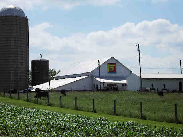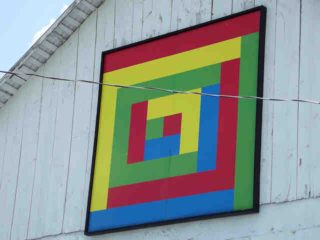 | (Log Cabin, OH-46-02) N. of North Lewisburg, Zane Township, Logan County, OH. OH559 N. 1.2 miles from jct with OH245/275 in North Lewisburg to the quilt on the W. side of the road at 10360. John & Alice Westfall. (N40 14.114 W83 33.928) Photos by Jack & June Schmidt 6-6-15. |