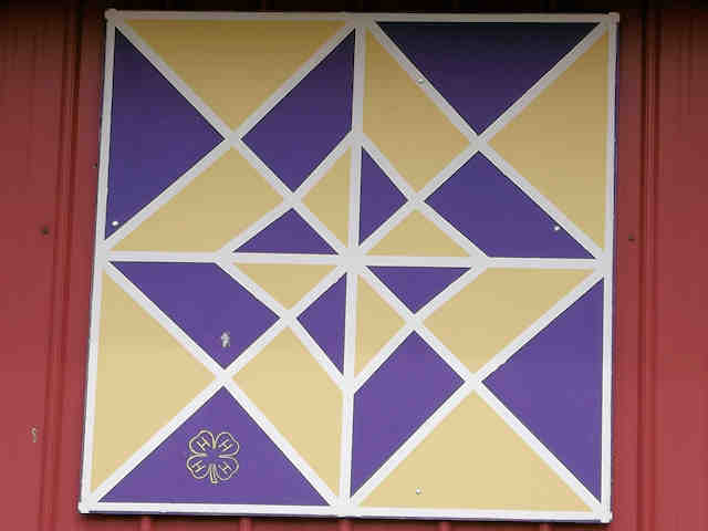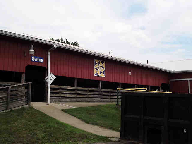 | (Night & Day, OH-79-04) in Dover, Tuscarawas County, OH. OH800 (Wooster Av.) SE 0.45 miles from jct with OH211 (Front St.), S. into fairgrounds 0.1 miles to the quilt on the E. side of the road on the swine barn. Tuscarawas County Fairgrounds. (N40 30.817 W81 28.056) Photos by Jack & June Schmidt 6-24-15. |