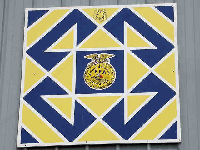 | (Jackknife, OH-79-05) in Dover, Tuscarawas County, OH. OH800 (Wooster Av.) SE 0.45 miles from jct with OH211 (Front St.), S. into fairgrounds 250, veer right 125, S. 100 yds to the quilt on the E. side of the road. Tuscarawas County Fairgrounds. (N40 30.832 W81 28.087) Photos by Jack & June Schmidt 6-24-15. |
