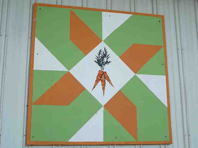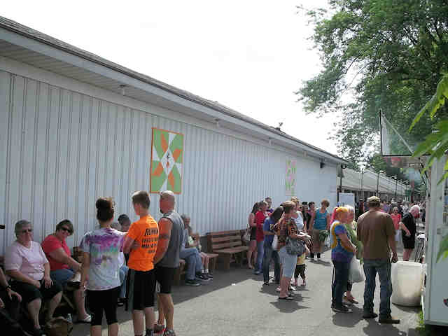 | (To Market, OH-79-08) in Dover, Tuscarawas County, OH. OH800 (Wooster Av.) SE 0.45 miles from jct with OH211 (Front St.), S. into fairgrounds 250, veer right 100 yds, S. 200, W. 100 to the quilt on the S. side of the road on the Fine Arts bldg. Tuscarawas County Fairgrounds. (N40 30.809 W81 28.163) Photos by Jack & June Schmidt 6-24-15. |