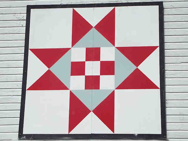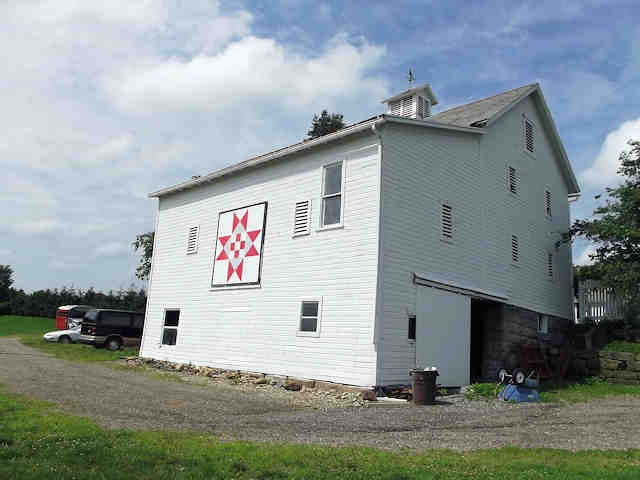 | (Dolly Madison Star, OH-79-20) in New Philadelphia, Tuscarawas County, OH. Broadway St. S. 0.1 miles from jct with US250, SE on OH416 0.3 miles, S. on Goshen Av. 0.45 miles to the quilt on the E. side of the road at 1151. John & Sue Davis. (N40 28.205 W81 26.615) Photos by Jack & June Schmidt 6-26-15. |