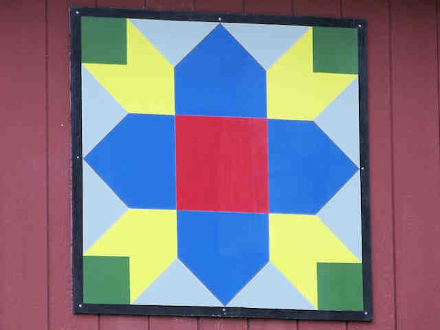 | (Weathervane, OH-79-22) S. of New Philadelphia, York Township, Tuscarawas County, OH. Broadway St. S. 0.55 miles from jct with US250 in New Philadelphia, W. on Hilan Av. (curves S. & becomes Hummel Valley Rd.) 1.5 miles to the quilt on the E. side of the road at 970. Ned & Sue Brandt. (N40 27.545 W81 28.085) Photos by Jack & June Schmidt 6-26-15. |