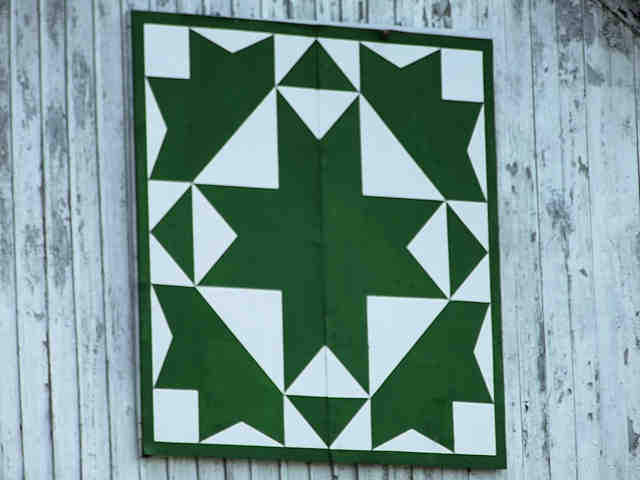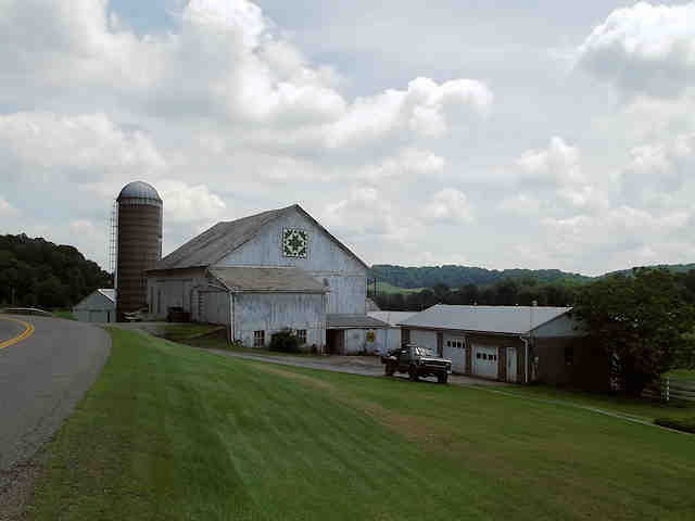 | (Sunburst, OH-79-27) S. of New Philadelphia, York Township, Tuscarawas County, OH. Broadway St. (becomes Oldtown Valley Rd.) S. 2.6 miles from jct with US250 in New Philadelphia to the quilt on the E. side of the road at 2235. Eric & Dan Lautze. (N40 26.701 W81 27.613) Photos by Jack & June Schmidt 6-26-15. |