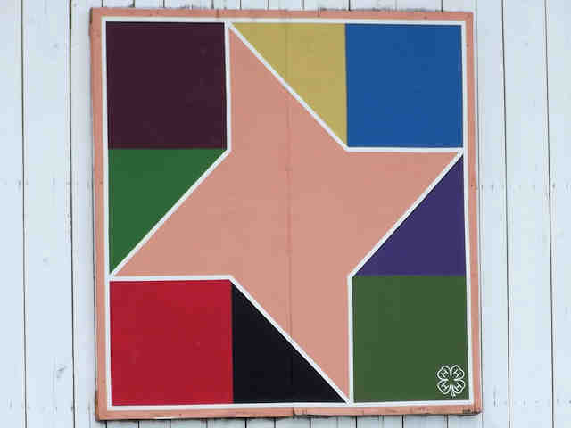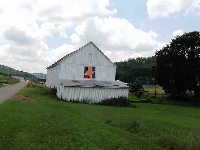 | (Friendship Star, OH-79-30) SSW of New Philadelphia, York Township, Tuscarawas County, OH. Broadway St. (becomes Oldtown Valley Rd.) S. 4.0 miles from jct with US250 in New Philadelphia, NW on Joyce Hill Rd. 1.1 miles to the quilt on the SW side of the road at 2656. Mary Lee Llewwilyn. (N40 26.693 W81 29.151) Photos by Jack & June Schmidt 6-26-15. |
