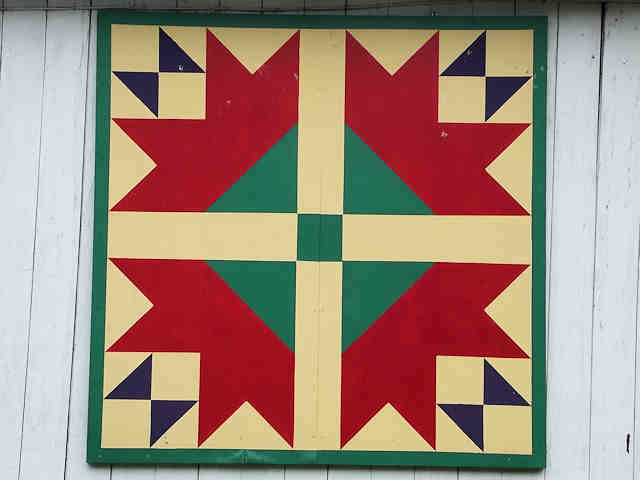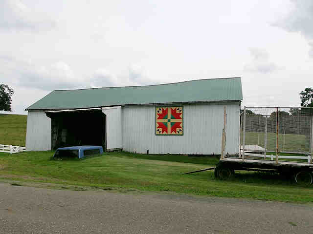 | (Batchelors Buttons, OH-79-42) SE of Sugarcreek, Auburn Township, Tuscarawas County, OH. Dutch Valley Dr. (becomes Rogersville Rd.) S. 3.0 miles from jct with OH39 E. of Sugarcreek, E. on Specht Rd. 0.75 miles, S. on Steiner Rd. 1.0 miles, E. on Crooked Run Rd. 0.1 miles to the quilt on the S. side of the road at 7874. Glenn Youngen. (N40 27.503 W81 35.623) Photos by Jack & June Schmidt 6-26-15. |