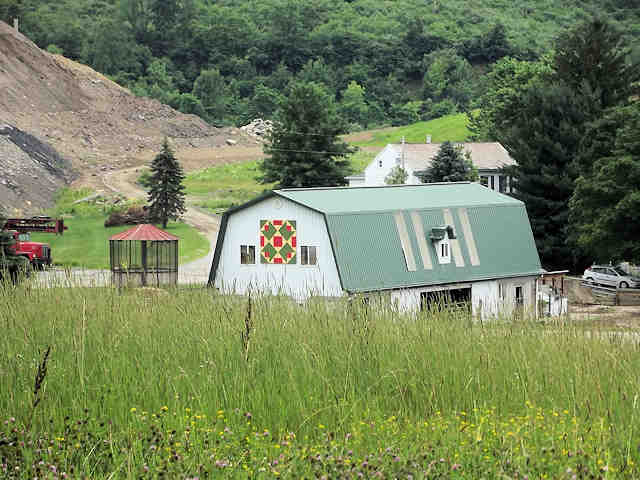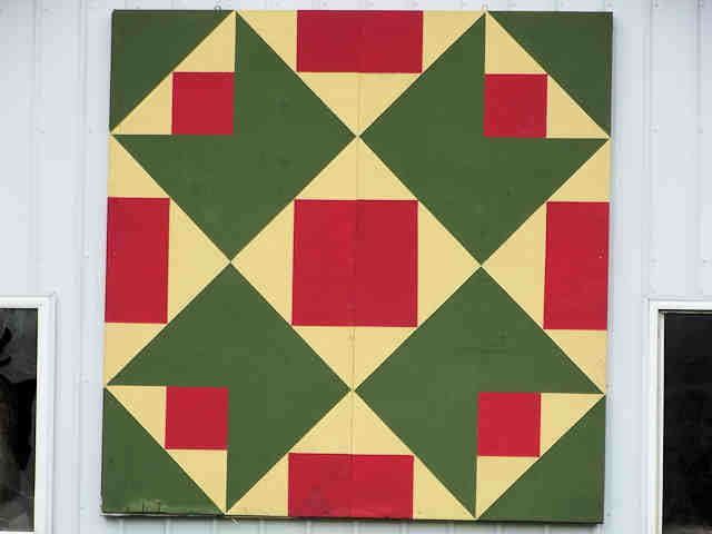 | (Six Windows of Sunshine, OH-79-48) W. of New Philadelphia, Dover Township, Tuscarawas County, OH. Stonecreek Rd. S. 100 yds from jct with OH39 at I77 exit 81 on the W. on Pleasant Hill Rd. 0.45 miles, veer right on a driveway 0.15 miles to the quilt on the N. side of the road at 1767. Laird Harstine. (N40 29.620 W81 29.584) Photos by Jack & June Schmidt 6-26-15. |