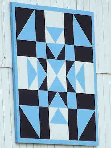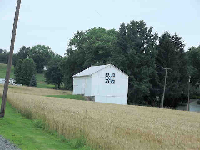 | (Tracks in the Snow, OH-79-52) W. of Dover, Dover Township, Tuscarawas County, OH. OH39 SW (curves W.) 2.15 miles from jct with I77 exit 83, N. on Ervin Rd. 0.2 miles, continue N. on driveway 0.25 miles to the quilt on the E. side of the road. John & Lynn Foust. (N40 30.894 W81 31.335) Photos by Jack & June Schmidt 6-26-15. |