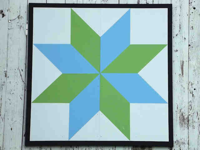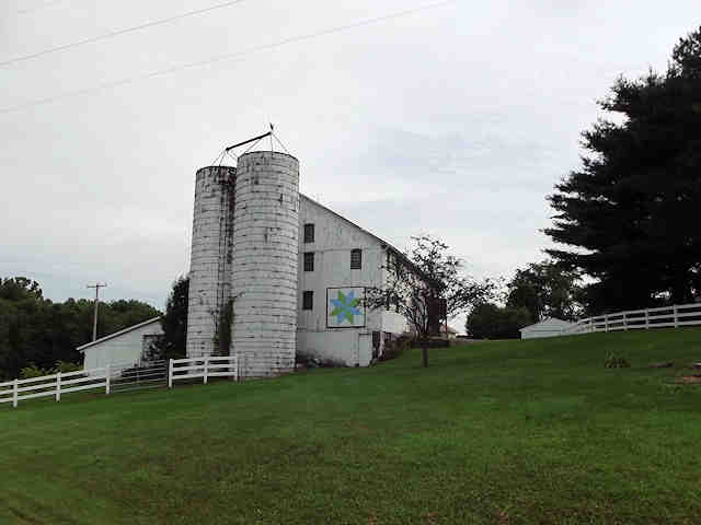 | (Lemoyne Star, OH-79-56) N. of Strasburg, Franklin Township, Tuscarawas County, OH. Zeltman Av. N. 0.9 miles from jct with US250, NW on Strasburg Boliver Rd. 0.4 miles to the quilt on the NE side of the road at 9497. Ryan & Ann Wallick. (N40 37.240 W81 31.652) Photos by Jack & June Schmidt 6-29-15. |