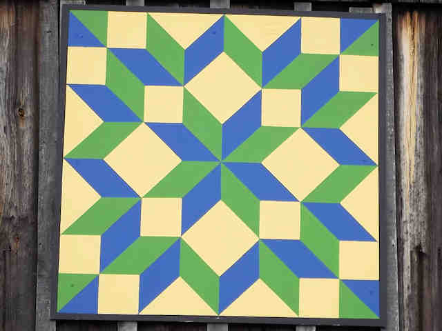 | (Carpenters Wheel, OH-79-58) in New Philadelphia, Tuscarawas County, OH. OH800 (Broadway St.) N. 3 blocks from jct with OH39 (High Av.), W. on 3rd St. 0.25 miles to the quilt on the S. side of the road. Amelia Odonnel Barn. (N40 29.577 W81 27.001) Photos by Jack & June Schmidt 6-29-15. |