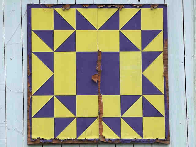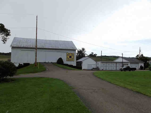 | (Robbing Peter to Pay Paul, OH-79-59) W. of Dover, Dover Township, Tuscarawas County, OH. OH39 W. 0.15 miles from jct with I77 exit 83 on the W. side of Dover, NW on OH516 3.75 miles, S. on Broad Run Dairy Rd. 0.5 miles to the quilt on the E. side of the road at 4253. Marilyn Harrold. (N40 32.503 W81 33.608) Photos by Jack & June Schmidt 6-29-15. |