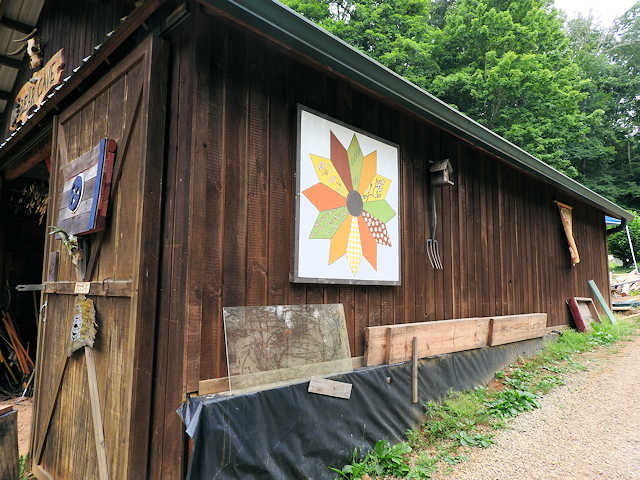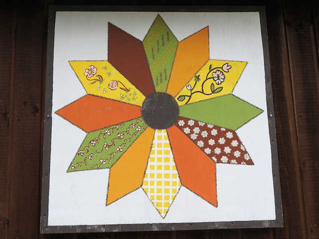 | (Dresden Plate, TN-01-05) S. of Clinton, Anderson County, TN. US25W S. 4.45 miles from jct with Charles Seivers Blvd in Clinton, W. on TN170 (Edgemoor Rd.) 1.9 miles, S. on New Henderson Rd. 2.0 miles, E. on Creek Rd. 0.1 miles to the quilt on the N. side of the road at 131. Colleen Miller. (N36 00.617 W84 07.628) Photos by Jack & June Schmidt 6-22-18. |