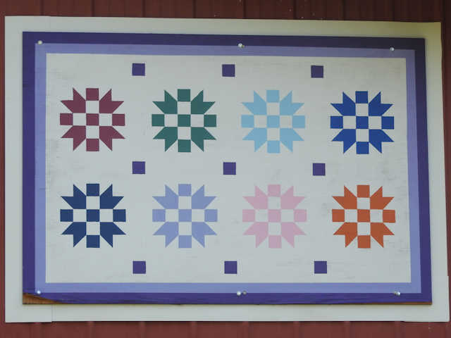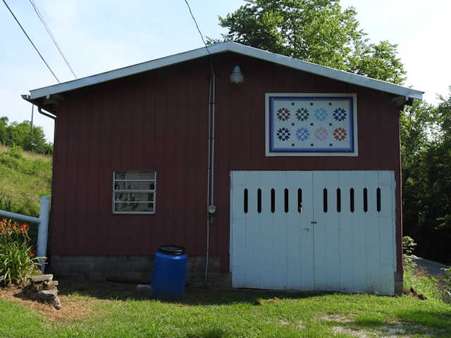| (Untitled, TN-80-05) N. of Carthage, Smith County, TN. TN263 (Main St., becomes Turkey Creek Hwy) N. 5.1 miles from jct with TN25 in Carthage, right & E. (curves N.) on TN85 (Defeated Creek Hwy) 4.15 miles to the quilt on the W. side of the road at 538. Grimsley Farm. (N36 20.958 W85 53.778) Photos by Jack & June Schmidt 7-11-18. |
