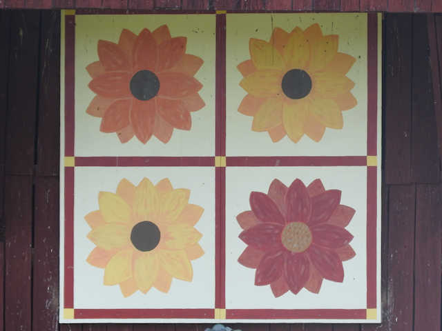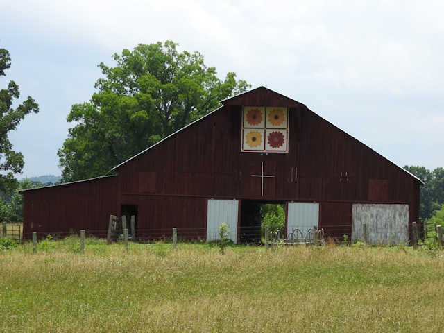 | (Sunflower, TN-93-06) N. of Walling, White County, TN. TN571 (Old Kentucky Rd.) N. 5.75 miles from jct with TN136 (McMinnville Hwy) in Walling, NW (curves W.) on Three Island Rd. 1.0 miles to the quilt on the S. side of the road at 1141. Karen Mecum. (N35 53.440 W85 36.507) Photos by Jack & June Schmidt 5-31-18. |
