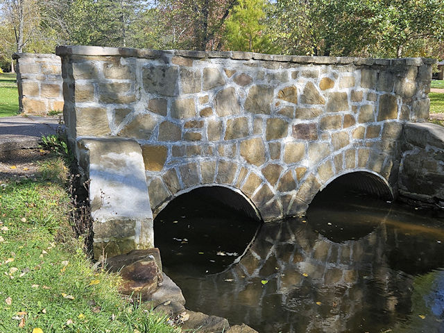 | (Iverson Park) across a stream in Iverson Park in Stevens Point, Portage County, WI. Main St. E. 100 yds from jct with Ridge Rd, S. (curves E.) into Iverson Park 0.1 miles, S. into parking lot to S. end, park & walk S. 150 yds to the bridge. (N44 31.230 W89 32.326) Photos by Mark & Clare Comstock 10-17-25. |