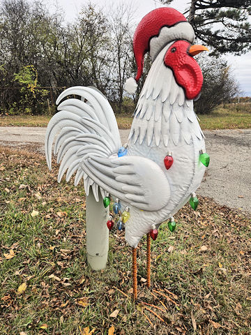 | (Rooster) E. of Ann Arbor, Superior Township, Washtenaw County, MI. Geddes Rd. E. (curves S.) 2.1 miles from jct with US23 exit 39 on th E. side of Ann Arbor to the statue on the E. side of the road at 6200. (N42 16.601 W83 38.267) Photo by Mark Comstock Dionis Forrest 11-11-25. |