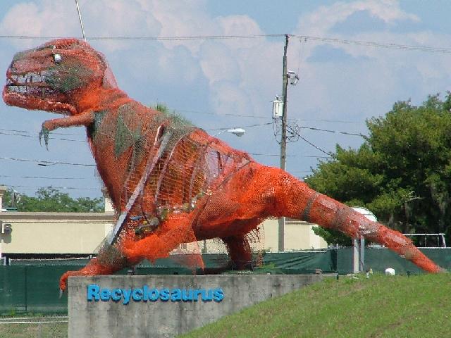 (Recyclosaurus) in Tampa, Hillsborough County, FL. FL582 (Fowler Av.) E. 3.2 miles from jct with I275 exit 51 to the statue on the S. side of the road at 4801. (N28 03.245 W82 24.329) Top 2 photos by Mark & Tim Comstock 1-8-25.