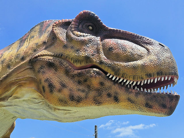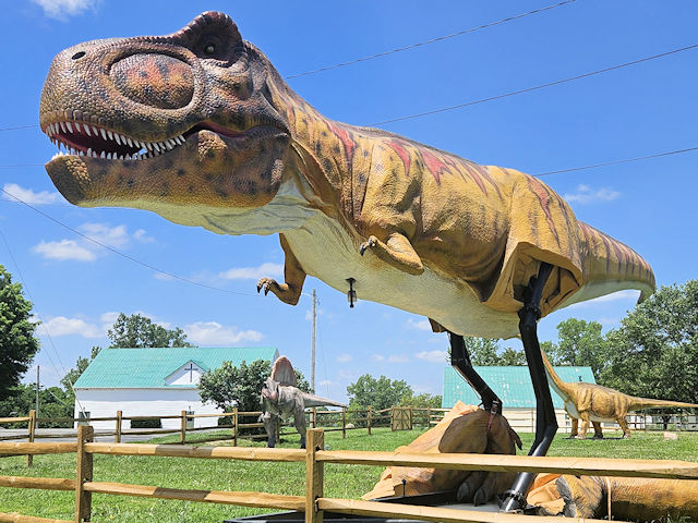 | (T-Rex) at Uranus Fudge Factory E. of Richmond, Wayne Township, Wayne County, IN. US40 E. 0.3 miles from jct with I70 exit 156, left to make a U turn & go back E. 0.1 miles, right & immediate left 0.15 miles, veer right (N.) 100 yds to the statue on the W. side of the road, just NW of the big cross. (N39 50.137 W84 48.931) Photos by Mark Comstock & Dionis & Nevaeh Forrest 6-22-25. |