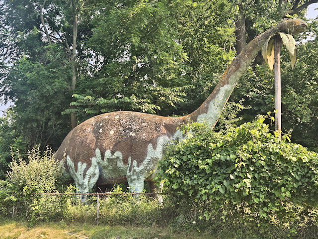| (Brontosaurus) at Prehistorid Forest SE of Brooklyn, Cambridge Township, Lenawee County, MI. MI50 S. 3.25 miles from jct with MI124 (Wamplers Lake Rd.) on the S. side of Brooklyn, E. on US12 3.8 miles to the statue on the S. side of the road at 8203. (N42 03.364 W84 08.899) Photo by Mark Comstock 8-2-25. |