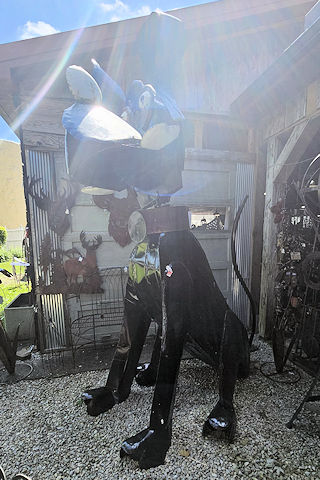 | (Dog) at The Watering Can N. of Centerville, Center Township, Wayne County, IN. Centerville Rd. S. 0.1 miles from jct with US70 exit 145 N. of Centerville, E. 0.2 miles to the statue on the S. side of the road at 2131. (N39 51.519 W84 59.565) Photo by Mark Comstock & Dionis & Nevaeh Forrest 6-22-25. |