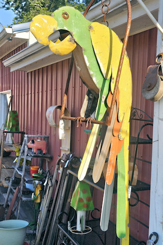 | (MaCaw) at Thrifty Treasures Antiques E. of Birch Run, Birch Run Township, Saginaw County, MI. Birch Run Rd. E. 2.0 miles from jct with I75 exit 136 on the E. side of Birch Run, N. on Gera Rd. 0.1 miles to the statue on the W. side of the road at 11970. (N43 15.086 W83 44.158) Photo by Mark Comstock 8-10-25. |