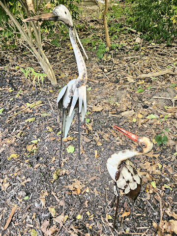 | (Stork & Baby) NW of Chelsea, Lyndon Township, Washtenaw County, MI. MI52 NW 2.25 miles from jct with Jackson St. in Chelsea, W. on Waterloo Rd. 3.55 miles, S. on Sugarloaf Lake Ln. 190' to the statue on the W. side of the road at 1573. Ask permission. (N42 20.763 W84 06.635) Photo by Mark Comstock & Sylvia & Chris Dietel 9-11-25. |