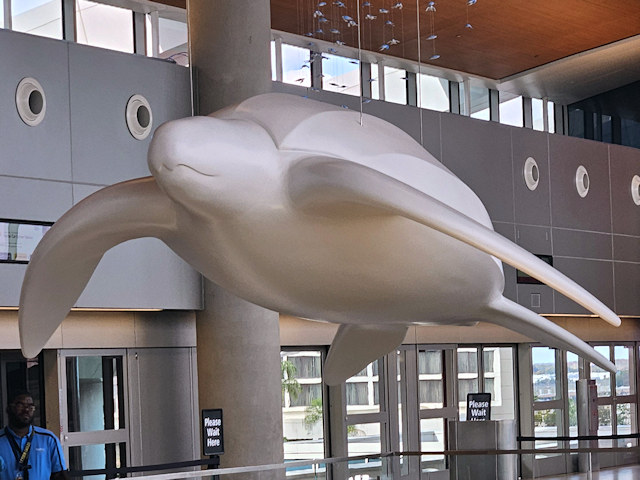 | (Leatherback Sea Turtle) in Tampa International Airport in Tampa, Hillsborough County, FL. The suspended turtle is above the escalators at the Sky Connect Station in the Main Terminal. It was created by Ralph Helmuk of South Africa in 2017. (N27 58.843 W82 32.112) Photo by Mark Comstock & Dave & Kristen & Zachary Storey 1-7-26. |