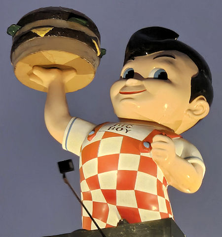 | (Big Boy) at Big Boy Restaurant S. of West Branch, West Branch Township, Ogemaw County, MI. Cook Rd. N. 0.3 miles from jct with I75 exit 212 S. of West Branch to the statue on the E. side of the road at 2981. (N44 14.967 W84 13.507) Photo by Mark Comstock 11-10-24. |