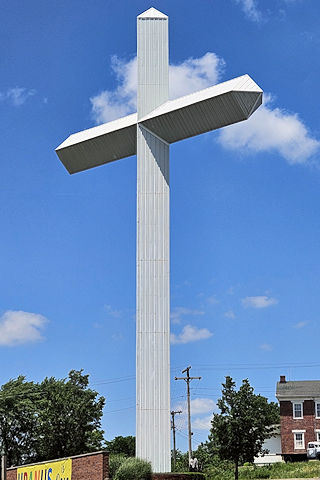 | (Cross, 110') at Uranus Fudge Factory E. of Richmond, Wayne Township, Wayne County, IN. US40 E. 0.3 miles from jct with I70 exit 156, left to make a U turn & go back E. 0.1 miles, right & immediate left 0.15 miles, veer right (N.) 200 to the cross on the W. side of the road. (N39 50.118 W84 48.911) Photo by Mark Comstock & Dionis & Nevaeh Forrest 6-22-25. |