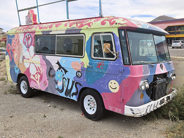 , Nye County, NV. On the SW side of Main St. (US6/95) 0.1 miles NW of Depot Rd. / Cutting St. [Clark Equipment Co. Cortez van] (N38 04.345 W117 14.290) Photos by Mark & Clare Comstock 9-17-25.