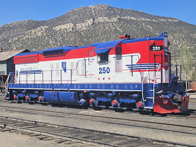| (EMD SD-9 Locomotive #250) at Nevada Northern RR Museum in Ely, White Pine County, NV. The museum is on the N. side of Ave A at the N. end if 11th St. The engine is stored on the N. side of the depot when not in use. (N39 15.564 W114 52.161) Photo by Mark Comstock 9-17-25. |